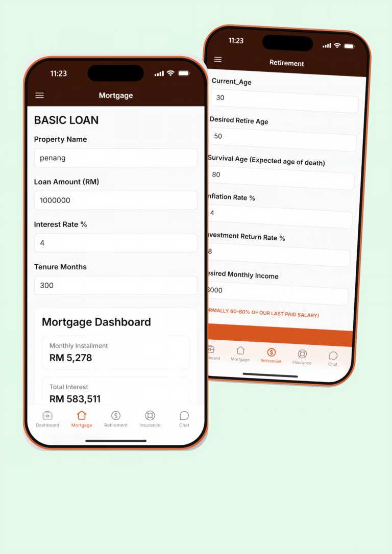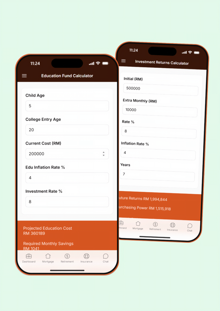 Your bank never told you that a few hundred Ringgit extra per month could shave 8–12 years off your tenure. AdvisorX gives you precision calculators for Mortgage, Retirement, Insurance, Investment, and Education — all engineered for the Malaysian financial landscape.